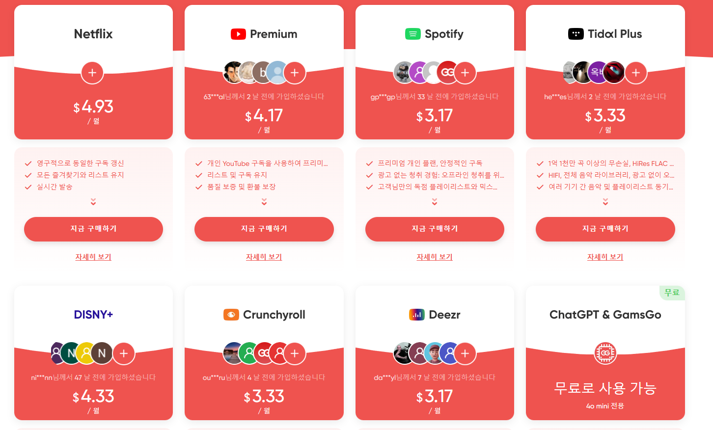 - 다양한 OTT 제공: 넷플릭스, 디즈니+, 스포티파이 등 다른 플랫폼도 함께 공유 가능.