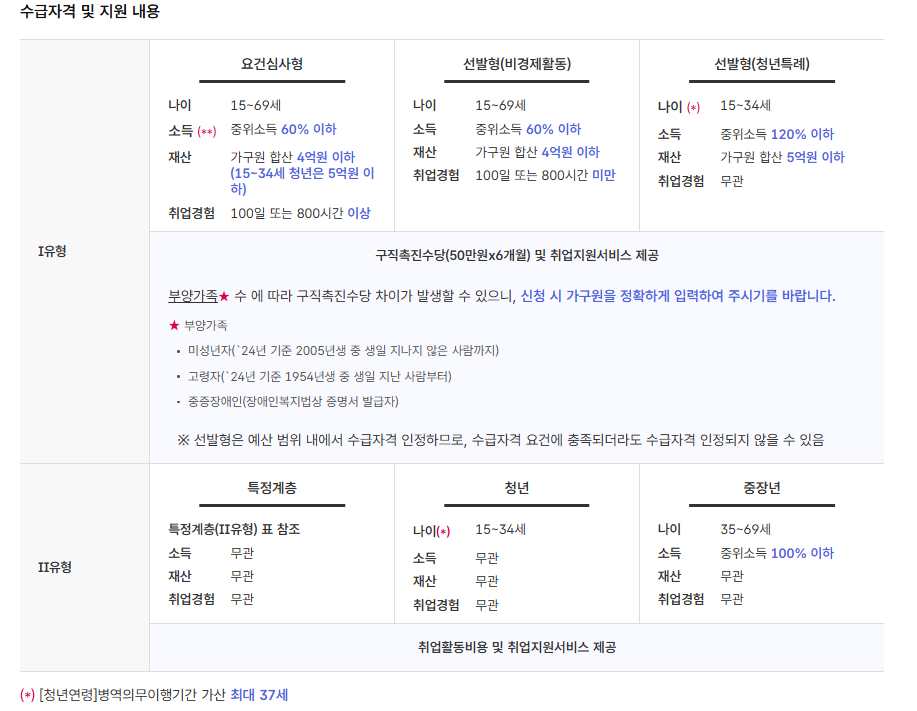 - 1유형(요건심사형, 저소득층): 취업활동 비용과 구직 촉진 수당을 제공.
