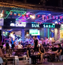 - 활기찬 밤 문화 카오산 로드의 밤은 낮보다 더욱 활기찹니다. 거리 곳곳에 자리한 바, 클럽, 라이브 음악 공연장이 밤이 되면 활기를 띱니다. 여행자들은 저렴한 가격의 술과 함께 새로운 사람들을 만나고, 음악을 즐기며 밤을 보낼 수 있습니다. 특히 많은 바에서는 태국 전통 음악뿐만 아니라 최신 팝송까지 다양한 장르의 음악을 제공합니다.